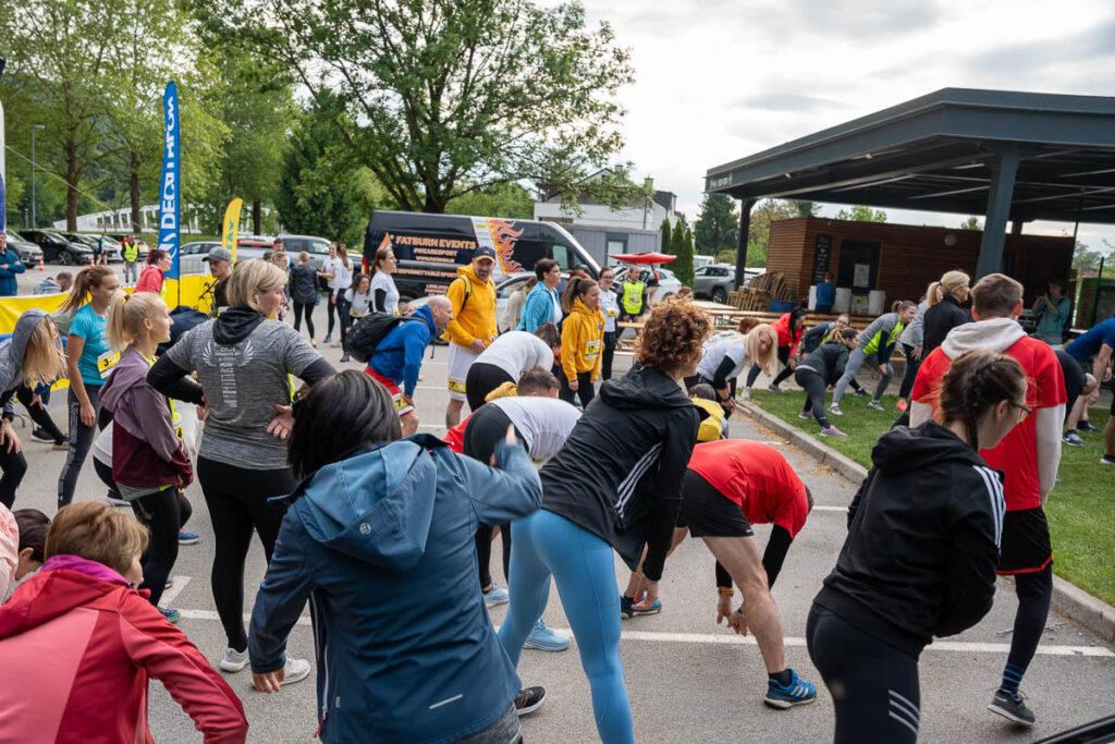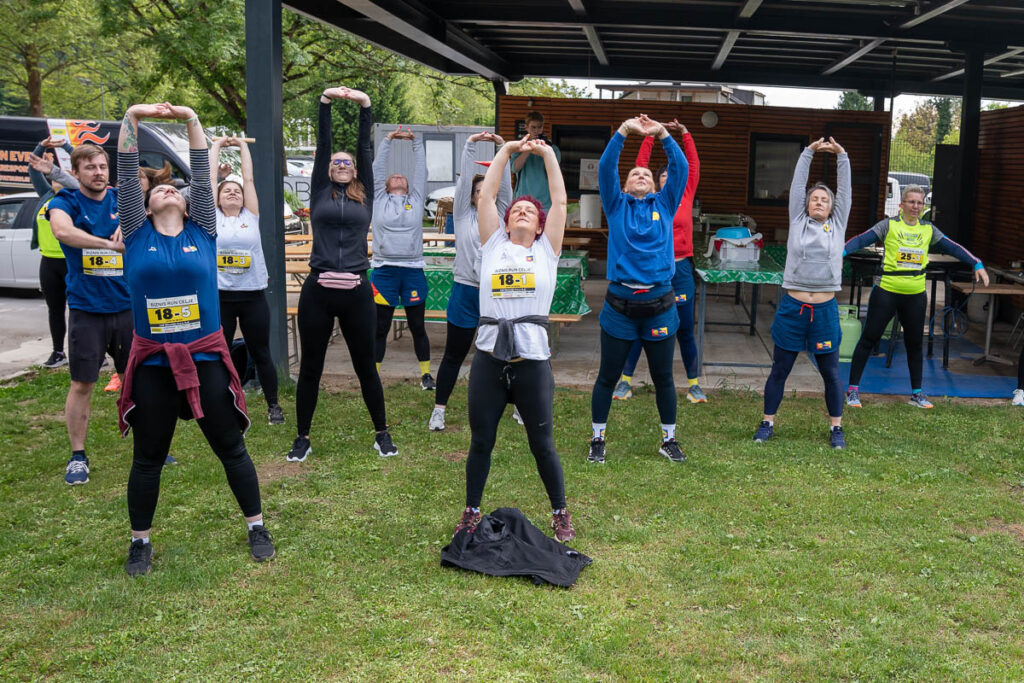 Najprej smo se seveda temeljito ogreli in pri tem nekateri že kar na polno tudi sopihali. Seveda nismo pretiravali, saj je bilo potrebno še teči in to celo po 2 km na posameznika. No nekateri so imeli ekipe manjše, kar je seveda pomenilo, da bo vsak moral odteči še en ali dva dodatna kroga. Trasa je bila namreč dolga 10 km, kar pomeni 5 krogov za vsako ekipo, seveda pa celotna ekipa teče zadnji krog skupaj.
